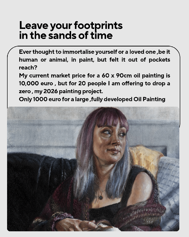 My current market price for such an oil painting is €10,000 (60 x 90cm), but for 20 patrons I am offering to drop a zero , making it only €1000 - my 2026 painting project.